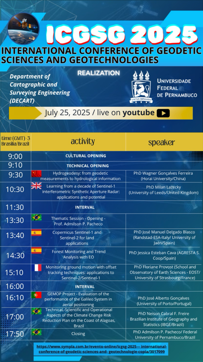 Divulga-se a sessão do “International Conference on Geodetic Sciences and Geotechnologies” que terá lugar no dia 25 de julho de 2025, online, entre as 9h00 e as 17h30.